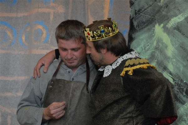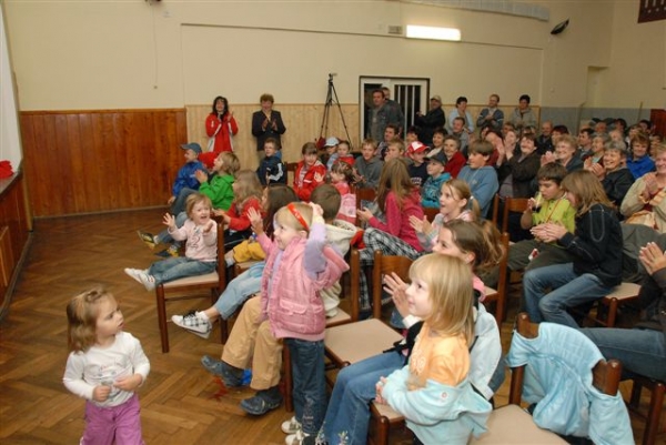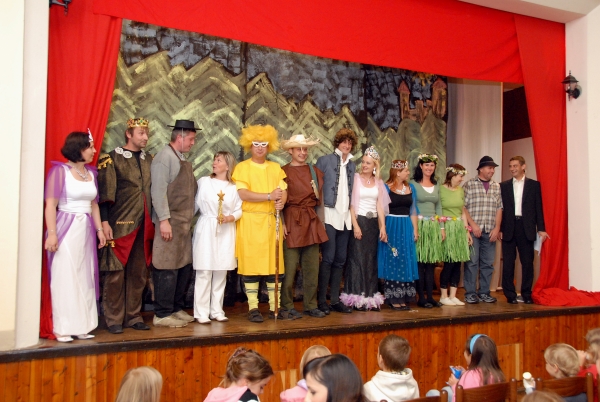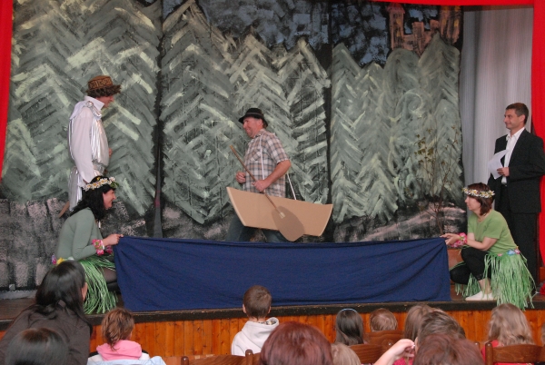 Dospělí si zahráli stejnou pohádku jako jejich děti . Bylo to pro ně první vystoupení před veřejností. Skvělý byl převozník syn Štěpán Kladiva a převozník otec Jiří Kladiva. Na jevišti se chovali oba stejně. Dokonalá výměna proběhla i u rolí Plaváček (syn Jan Pavel Jíša a otec Zdeněk Janů), Král (syn Jan Pokorný a otec Martin Pokorný), Uhlíř (syn Jakub Fürbacher a otec Miroslav Fürbacher), víla (dcera Anna Suchá a matka Blanka Suchá). U dalších rolí došlo k záměně pohlaví - vypravěč (dcera Edita Filandrová a otec Pavel Filandr). Různé role ale stejné pohlaví proběhly u víly (dcery víly Simona Filandrová a Natálie Šetková a matky královny Marta Filandrová a Michaela Šetková). Čestná role u dospělých připadla Václavu Šestákovi, který je velkým divadelním nadšencem. Další role dostali rodiče, kterým účinkovalo jedno dítě a tudíž jeho roli už jeden rodič převzal. Taková situace nastala u Hany Kladivové (syn převozník, ona víla), Stanislava Šetka (dcera víla, on rybář), Jany Fürbacherová (syn uhlíř, ona víla), Blanky Jíšové (syn Plaváček, ona královna). Z fotografií je vidět zodpovědný přístup k rolím.